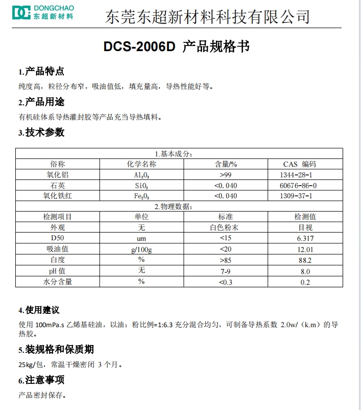 适用于制作导热系数2.0W/m·K低粘度有机硅导热灌封胶,经过特殊改性技术处理,提高颗粒间堆积致密性,粉体与硅油相容性。100cp乙烯基硅油添加630份(油粉比1:6.3),流动性良好、性能稳定。