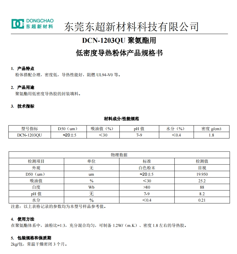 导热聚氨酯粘接胶在较低的填充比例下提升导热性能?推荐产品DCN-1203QU,适用于制作导热系数1.2W/m·K低密度聚氨酯粘接胶,专门针对聚氨酯体系的处理剂,并通过特殊技术对粉末进行改性,提升了粉末与树脂的相容性。1000cp聚氨酯中添加300份(油粉比1:3),流动性良好、性能稳定。高端功能性粉体,东超新材料免费开发设计配方.