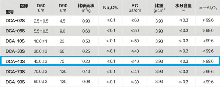 DCA-40S系列球形氧化铝主要性能指标: