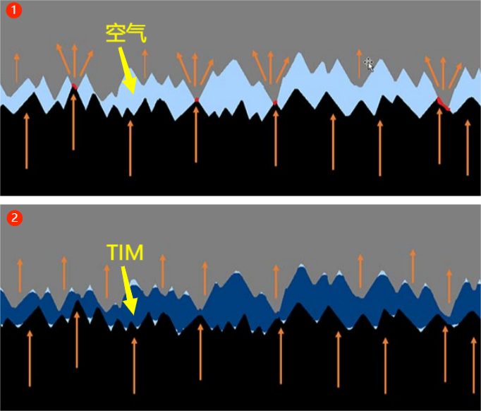 ▲散热器热传递示意图(来源:boydcorp.com)。上图①没有使用TIM,来自黑色表面的热量只能在红色高亮点传导至灰色散热器。橙色箭头有助于视觉化来自整个黑色表面的热量,但实际只有相当少的几个红色接触点,气袋以浅蓝色表示。热量当然也可以通过浅蓝色气袋传导,但相比通过红色接触点的传导水平,非常低效且量很小;上图②中深蓝色代表热界面材料。大部分浅蓝色气袋已经被消除,由更具传导性的柔软的热界面材料代替。TIM可以填充两个表面之间的空隙,从而增加有效接触面积,配合热界面材料自身的高导热率,可以很好的解决材料接触界面的热传导不顺畅的问题。多数情况下,100%消除空气几乎不可能,因此,小凹陷和小孔中仍然会有小气袋。但是,此时的热性能相比未使用TIM的情况已有极大改善;这也适用于任何电设备。电设备通常密封在箱体内,不通过热界面材料将热量传导至金属散热器。