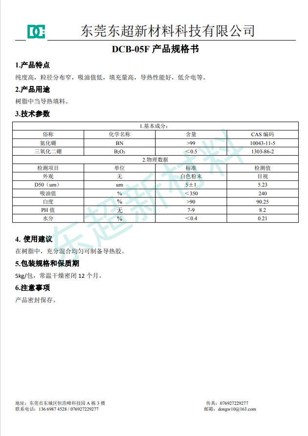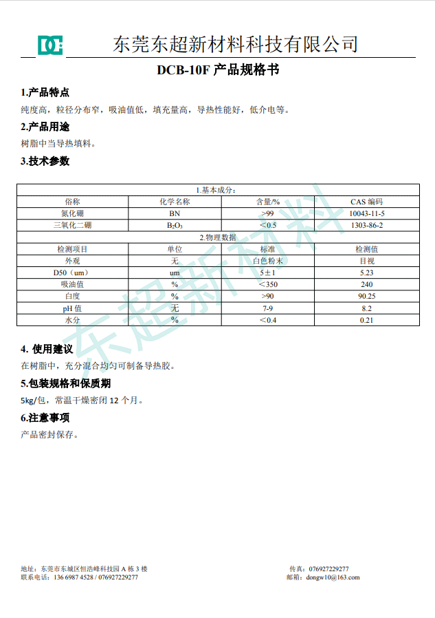 高导热填料-氮化硼粉典型应用● 金属成型的脱模剂和金属拉丝的润滑剂。● 高温固体润滑剂、挤压抗磨添加剂、耐火材料抗氧化添加剂。● 晶体管的热封干燥剂和塑料树脂等聚合物的添加剂。● 热屏蔽材料。● 制备立方氮化硼原料。● 高压高频电及等离子弧的绝缘体、自动焊接耐高温支架的涂层、高频感应电炉的材料、半导体的固相掺合料、原子反应堆的结构材料、防止中子辐射的包装材料、雷达的传递窗、雷达天线的介质和火箭发动机的组成物等。